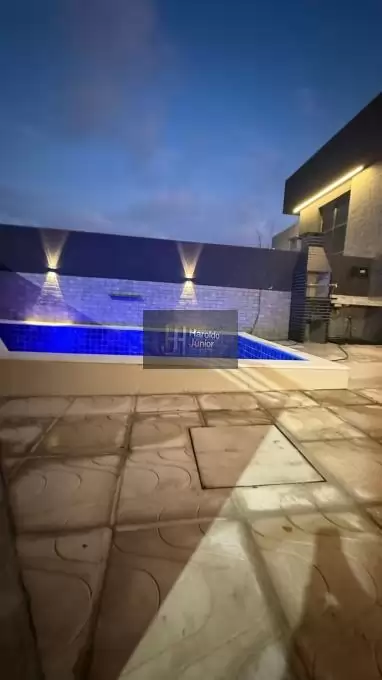 Piscina com cascata, iluminação em LED, com borda em mármore branco.